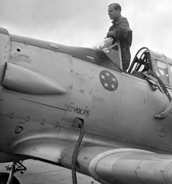 The Prince Philip, Duke of Edinburgh, stands in the front cockpit of a North American ‘Harvard’ advanced trainer in 1953. Original photo source uncertain/unknown. Versions are posted on multiple websites.