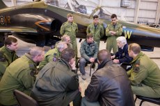 Sweanor was visited and honored at Peterson Air Force Base, which in part serves as NORAD headquarters, in Colorado Springs by members of RCAF 419 Tactical (Training) Squadron/419e Escadron d’entraînement à l’appui tactique. One of the unit’s CT-115 Hawk advanced trainers was painted in a WW2 bomber livery for the occasion and placed inside a hangar behind George Sweanor and his admirers.