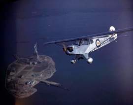 Johnston Flying Service provided the ‘Primary’ phase. The inventory of training aircraft included two Piper J-3 Cubs, one yellow and one silver. Mr. Cooper commented, “The silver aeroplane, called a ‘Flitfire’ model, had British roundels on the wings and fuselage to remind us of the Royal Air Force’s Spitfire fighter.”