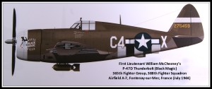 Sometime prior to 25 August 1944 Bill engaged in air-to-air combat with Luftwaffe fighters. He was flying a heading of 260 magnetic and headed for the English Channel. Suddenly, he saw 4 ‘dots’ at a 45 degree angle to his P-47. Mr. McChesney allowed the unidentified aircraft to close on him, knowing in his gut that that they were Messerschmitt Bf 109s.